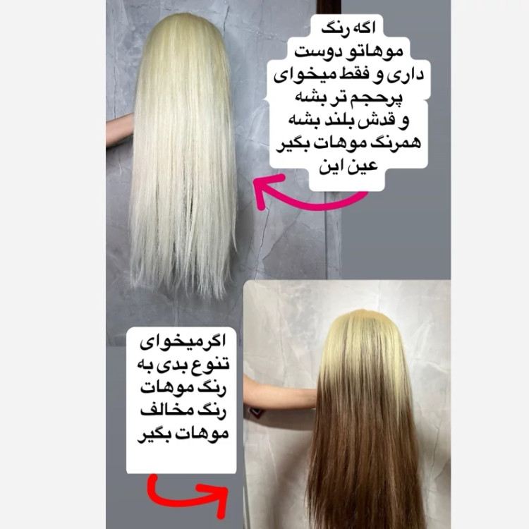از این اکستنشن ها هم برای لایت دهی هم برای حجم دهی و قد دهی به موهاتون میتونید استفاده کنید دقت کنید برای اینکه طبیعی تر دیده بشن باید پایین موهاتون حالت نامنظم کوتاه شده باشه که موها ی خودتون با این موها ترکیب بشن اگر موهات خط کات داره و لیزری کوتاه شده مناسب نیست و باید پایین موهارو نامنظم کنید نحوه نصب ♂️♂️آموزش نگهداری و نصب موهای گیره دار✅مو که به دستتون رسید اگر داخل بسته بندی کمی حالت گرفته ودر هم شده ❌به هیچ وجه به یکباره از بالا برس نکشید❌✅ابتدا مورو از بالا روی هم تاه کنید و قسمت وسط مورو محکم بگیرید ✅سپس اول قسمت های پایین مو رو برس بکشید ✅بعد دستتون رو ببرید کمی بالاتر رو بگیرید وقسمت میانی مورو شانه بزنید ✅و درنهایت روی گیره هاروبگیرید و بالاهارو شانه بزنید به همین راحتی✅اگر خواستید اتوی مو هم میتونید بکشید ✅موهارو به چوب لباسی اویزان کنید ولایه لایه از کنار جدا کنیدو اتورو به اهستگی از بالا به پایین بکشید❌و هرگز اتو رو روی مو نگه ندارید و نواحی اتو کشیده رو بلافاصله با دست نگیرید چون روی مو خط میوفته❌❌میتونید کمی اب و نرم کننده هم بهش اسپری کنید بعد اتو کشی کنید ♂️♂️نحوه نصب موهای گیره دار♂️♂️ ✅ابتدا یه لایه از روی موهای خود گوش تا گوش جدا کنید و بالای سرتون کلیپس بزنید ✅سپس گیره های مو مصنوعی رو باز کنید و دور تا دور سرتون نصب کنید✅ سپس موهای خودتون رو که از قبل صاف و لخت کردید رو روی این موها بندازید ❌اگر سوالی داشتی و متوجه نشدی حتما داخل روبیکا و یا تلگرام به آیدی پیام بدید تا ادمین ها فیلم و اطلاعات بیشتری براتون بفرستن ❌ : نصب اسان با 4 گیره
