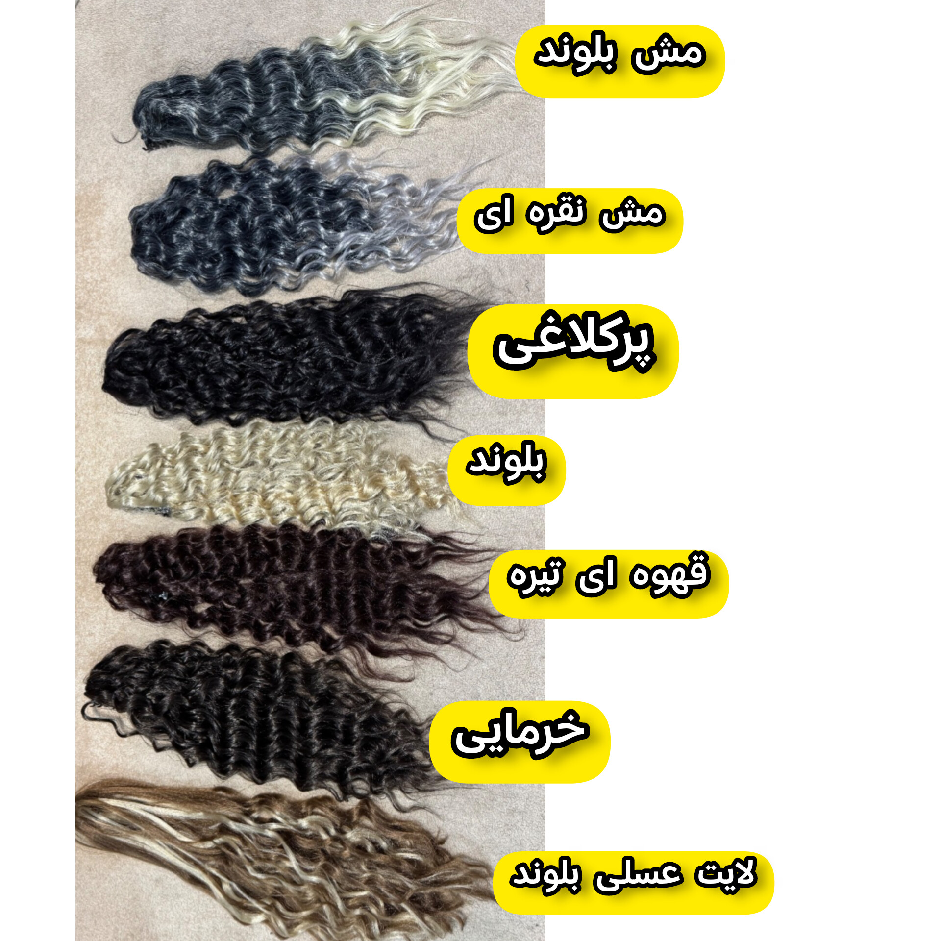 تمامی کارها به سفارش شما تولید و آماده میشن و برای واضح بودن رنگ ها کاتالوگ رنگ ها بصورت صاف گذاشته شده و موها بصورت کلیپس دم اسبی فر ارسال میشه پس حتما از اپلیکیشن بله یا روبیکا مدل فر مد نظرتون و رنگ دلخواهتون رو بهمون بگید در غیر اینصورت مدل فر رندوم ارسال میشه